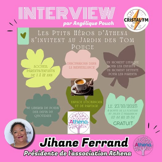 CHACUN POUR TOUS - Nous parlerons d’un moment de partage et de détente à vivre en famille proposé le lundi 27 octobre à Terrasson-Lavilledieu par l’association Athena : « Les P’tits Héros d’Athena s’invitent au Jardin de Tom Pouce » : un rendez-vous gratuit, pour les enfants de 1 à 12 ans et leurs parents. Pour nous en parler plus en détail, Angélique Pouch s'est entretenue avec Jihane Ferrand, présidente de l’association Athena, qui est à l’initiative de ce projet.