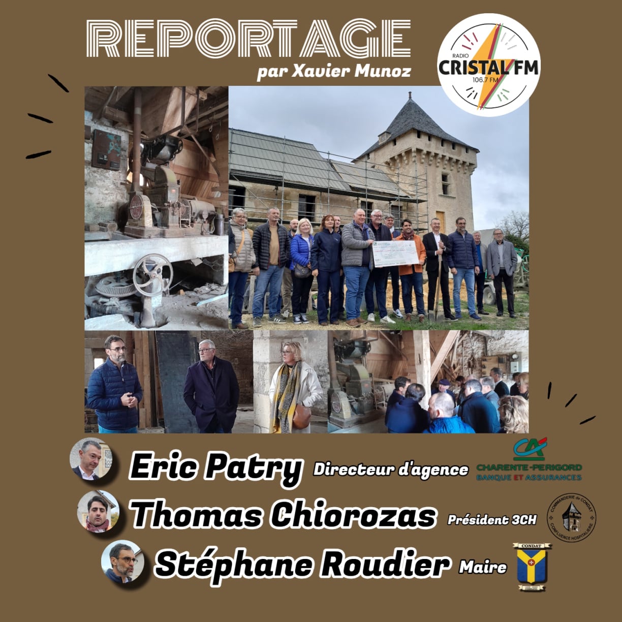 COULEURS PERIGORDS - Samedi 8 novembre Eric Patry, directeur d’agence du Crédit Agricole Charente-Périgord a remis un chèque de 40.000€ à l’association 3CH Commanderie de Condat Confluence Hospitalière : l'association Commanderie Condat Confluence Hospitalière en charge de l’opération de rénovation de cet édifice. A cette occasion, et pour cette nouvelle édition, Xavier Munoz a pu s’entretenir avec Eric Patry, directeur d’agence du Crédit Agricole Charente Périgord, ainsi que le maire de Condat sur Vézère, Stéphane Roudier, accompagné de Thomas Chiorozas, président de l’association 3CH.