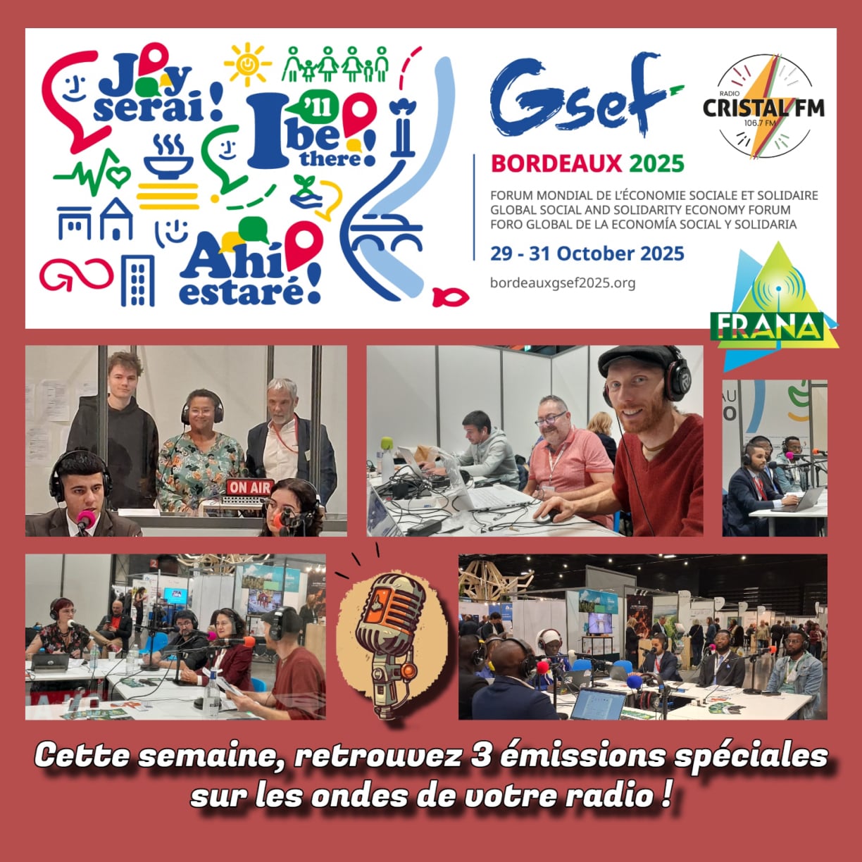 ÉMISSIONS SPÉCIALES GSEF 2025 - Le GSEF - Global Forum for Social and Solidarity Economy 2025 qui s'est tenu la semaine dernière, était le grand rendez-vous mondial de l’Économie sociale et Solidaire ! Pendant trois jours, acteurs, collectivités et citoyens du monde entier se sont retrouvés à Bordeaux pour échanger, débattre et imaginer ensemble une économie plus juste et durable... La FRANA : Fédération des Radios Associatives de Nouvelle-Aquitaine, était présente sur place et a installé un plateau radio ouvert à tous les acteurs de l’événement. Trois émissions spéciales ont été réalisées en direct les 29 et 30 octobre, sont à retrouver cette semaine sur Cristal FM. Cette première émission est consacrée au positionnement de l'Economie Sociale et Solidaire dans le monde...