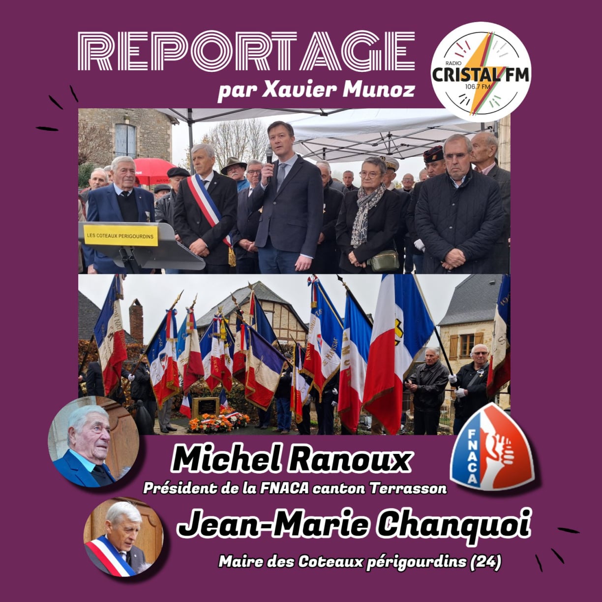 COULEURS PERIGORDS - Samedi 8 novembre, la commune des Côteaux Périgourdins dévoilait une plaque commémorative en hommage aux anciens combattants en d’Algérie et d’Afrique du Nord, tout près du Monument aux Morts du bourg de Chavagnac (24). A cette occasion, et pour cette nouvelle édition, Xavier Munoz s’est entretenu avec le maire des Côteaux Périgourdins, Jean-Marie Chanquoi, ainsi qu'avec le président du comité de Terrasson de la Fédération nationale des anciens combattants en Algérie, au Maroc et en Tunisie : la FNACA, Michel Ranoux.
