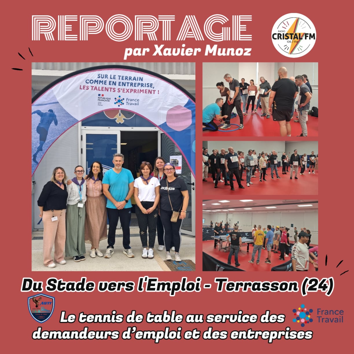 TERRAZOOM - Jeudi 10 octobre, l’antenne France Travail de Terrasson-Lavilledieu, organisait depuis la salle du Tennis de Table, l’opération : « Sur le terrain, comme en entreprise, les talents s’expriment ! » dans le cadre "Du stade vers l'emploi ». A cette occasion, Xavier Munoz pour une nouvelle édition, s’est entretenu avec Fatima Saadi, et Cécile Coulié, respectivement directrice et responsable d'équipe de l’antenne terrassonnaise de France Travail. Bernard Beaudry, maire adjoint en charge des associations pour la Municipalité de Terrasson, a également salué cette initiative.