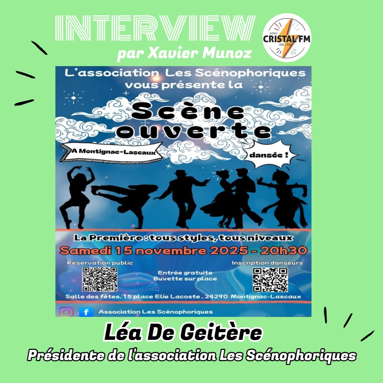 CULTURA POP - L’association Montignacoise « Les Scénophoriques » prépare sa toute première scène ouverte ! Cet évènement aura lieu samedi 15 novembre à partir de 20h30 à la salle des fêtes. Lors de cette soirée, danseuses et danseurs de tous horizons se lanceront le challenge de danser face à un public. Il y aura des débutants, des plus expérimentés, des styles variés et surtout, une ambiance bienveillante. Pour nous en dire plus dans une nouvelle édition, Xavier Munoz s’est entretenu avec Léa De Geitère, présidente de l'association Les Scénophoriques, organisatrice de l'événement.